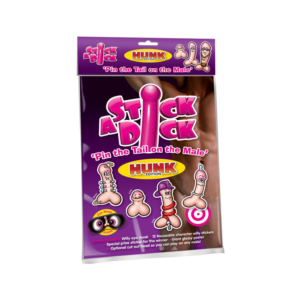 Stick a Dick is the grown up version of the old party favourite Pin The Tail On The Donkey. Unfold the almost life size naked man, choose your weapon from the 12 reusable sticky dicks, don your mask, then spin around three times and place your sticker where you think it should go. The results are hilarious. And if youre closest to the target, youll be cock a hoop, with a clever dick sticker to prove it.